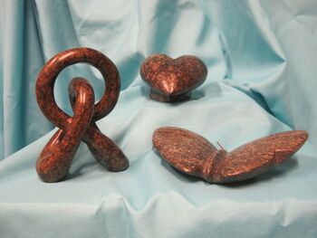 De knoop, het hart en de vlinder op de foto zijn allemaal gemaakt van serpentijn.